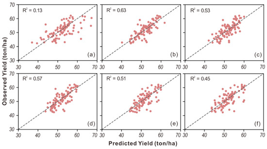 The scatter plots of observed vs. predicted tuber yield from (a) OLS, (b) Ridge, (c) PLSR, (d) SVR, (e) RF, and (f) AdaBoost.