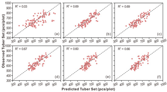 The scatter plots of observed vs. predicted tuber set from (a) OLS, (b) Ridge, (c) PLSR, (d) SVR, (e) RF, and (f) AdaBoost.