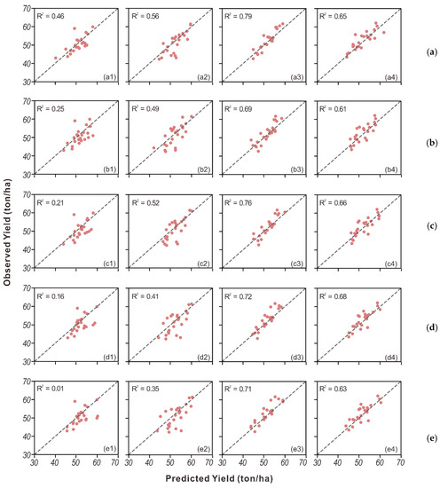 Scatter plots of observed vs. predicted yield from (a) Ridge, (b) PLSR, (c) SVR, (d) RF and (e) AdaBoost for groups with four different irrigation treatments: (1–4) 50% of ETc, 75% of ETc, 100% of ETc, and 125% of ETc.