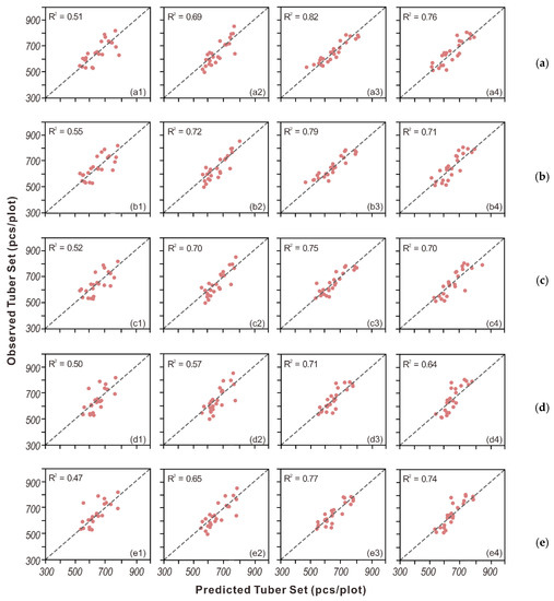 Scatter plots of observed vs. predicted tuber set from (a) Ridge, (b) PLSR, (c) SVR, (d) RF, and (e) AdaBoost for groups with four different irrigation treatments: (1–4) 50% of ETc, 75% of ETc, 100% of ETc, and 125% of ETc.
