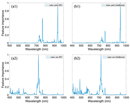To explore which hyperspectral band is important for predicting the tuber yield and tuber set, we computed the feature importance using the Gini index which has been widely adopted in tree-based models (Random Forest and AdaBoost) [43,44,45].