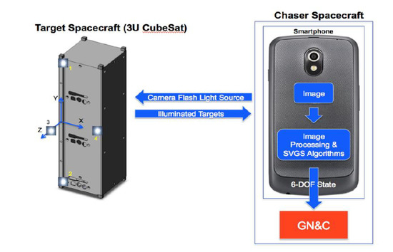 The operational concept of Smartphone Video Guidance Sensor (SVGS) [7]. The target’s six-degrees-of-freedom (DOF) state can be transmitted from the SVGS device to the spacecraft’s guidance, navigation and control system (GN & C).