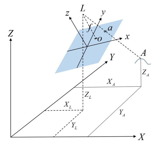 AVGS uses the Inverse Perspective algorithm [10] to calculate the 6-DOF relative state between the target and chase vehicles. SVGS, on the other hand, uses photogrammetry techniques [13,14] and an adaption of the collinearity equations developed by Rakoczy [8] to solve for the desired state vector. If a thin lens camera system captures point A as shown in Figure 2 [8], all light rays leaving point A and entering the camera are focused at point L (called the perspective center), at the location of the camera lens. An image of point A on the image plane is represented as point “a”; the image plane is located a distance f from the perspective center, where f is the focal length of the lens. Figure 2 shows two coordinate frames: the object (or target) frame <X, Y, Z>, and the image (or chase) frame <x, y, z>. A vector from the perspective center to point “A” can be defined in the object frame as vA, while a vector to point “a” from the perspective center is va: