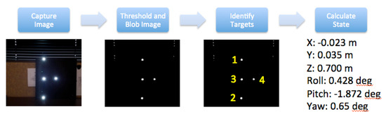 Figure 1 shows the operational concept of SVGS. Estimating the target’s position and attitude relative to the camera’s coordinate system starts with the image capture of a set of illuminated targets. The six-degrees-of-freedom position and attitude vector are estimated using geometric photogrammetry techniques [7,8,15], where all image processing and state estimation are performed onboard the smartphone, alleviating the computational load on a motion control computer.