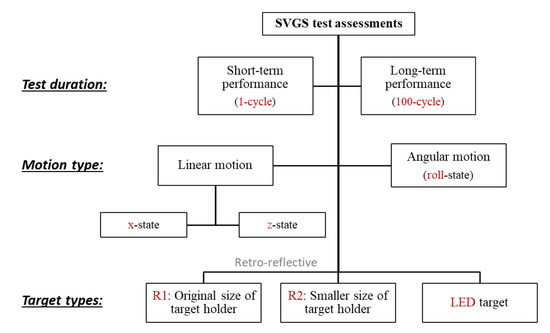 Figure 6 shows an overview of the assessment tests performed. The short-duration (single cycle) tests estimate the semi-static accuracy of the measurements, while the long-duration tests (100 cycles) were intended to estimate the statistics of the measurement error. In the short-duration tests, the SVGS targets were moved following a single cycle of a sinusoidal motion profile provided by a computer-controller motion stage with encoder feedback. The targets were moved following a single axis of motion at a time, while the remaining 5-DOFs were kept constant. Both the x- and z-axes of the SVGS measurements were tested, as well as roll-state (single-axis rotation).
