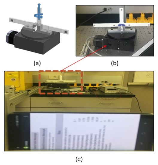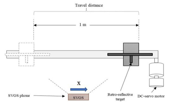 The assessment of SVGS performance in measuring target rotational motion around the roll axis was performed using a computer-controlled rotary motion stage as shown in Figure 10. The rotary motion stage (Figure 10a) includes a 1:180 gear reduction, providing an angular resolution of 0.01°. The SVGS smartphone was placed 2 m away from the motion stage holding the target (Figure 10c).
