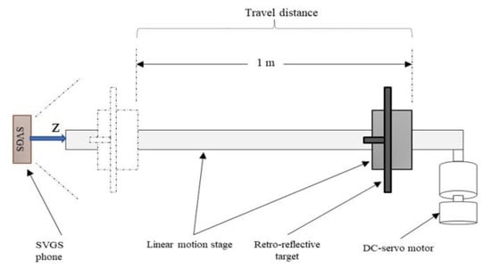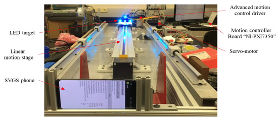 Figure 9 shows the experimental setup used to achieve precise motion profiles using a linear motion stage. The motion stage is controlled by a real-time National Instruments motion controller (NI-PXI-7350, Budapest, Hungary), which drives a DC motor with a built-in high-resolution encoder. Encoder measurements are used as reference signal for the actual motion of the carriage, which can then be compared to SVGS data.