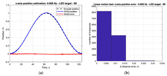 Figure 11a shows the actual motion of the carriage during a single-cycle test (1 m peak-to-peak sinusoidal at 0.008 Hz) as measured by the encoder, along with the corresponding SVGS position estimation for the z-axis. Figure 11b shows a histogram of the position error (difference between the reference motion and SVGS measurements), showing that at this target speed, the position errors in the z-axis stay within 1% of the range of motion.