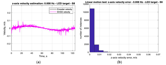 The accuracy of the SVGS-based linear velocity estimation for the same motion profile was investigated. Figure 12a compares the SVGS-based velocity estimate with the actual velocity of the moving target. The SVGS-based velocity estimate is based on finite differences, and a histogram of the velocity error (Figure 12b) enables estimation of the noise statistics. For the long-duration performance assessment, 100-cycle tests are used since long-duration stability is critical for the successful use of SVGS in satellite or spacecraft applications. The long-duration tests (100 cycles) were used to estimate the statistics of the measurement error by measuring the distribution of the measurement errors as shown in Figure 11b, Figure 12b, Figure 13b and Figure 14b.