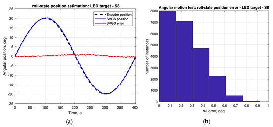 (a) Angular position measured by encoder and SVGS-based angular-position estimate (roll-axis). (b) Histogram of angular-position measurement error (roll-axis).