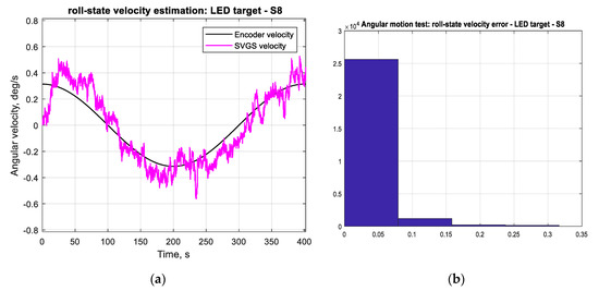 (a) Angular velocity measured by encoder and SVGS-based angular velocity estimate in roll-axis. (b) Histogram of angular-velocity estimate error in roll-axis.