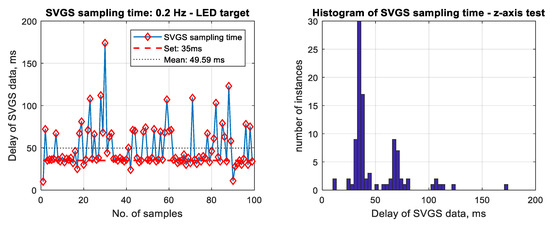 Latency has significant impact in vision-based positioning systems due to the time needed for image acquisition and image processing [7,8]. Several factors affect the sampling time of a vision-based system, such as the available processor power, complexity of the acquired image and type of target. In its current version, SVGS is an Android application, and as such, it does not run in real time due to fluctuations in CPU load that lead to non-deterministic sampling times, as shown in Figure 15, where the plot on the left shows number of samples versus the time between samples, while the figure on the right shows the corresponding histogram of sampling time. This sample test was conducted with the LED target and 0.2 Hz motion profile (z-axis). The means of the SVGS sampling times for the three different targets and motion velocities are shown in Section 3.3.