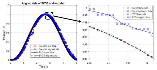 For error assessment purposes, the varying sampling rate of SVGS requires additional processing before direct comparisons between SVGS and encoder data for error analysis can be made. SVGS data were processed off-line to ensure the alignment of the SVGS and encoder samples in the time domain. The Dynamic Time Warping tool in Matlab’s [16] Signal Processing Toolbox was used to provide equally spaced data points for both measurements, as shown in Figure 16.
