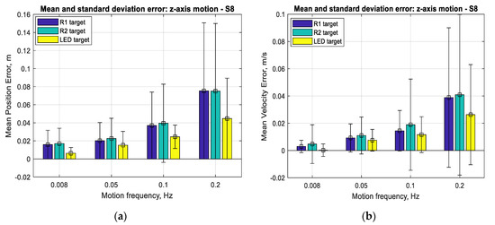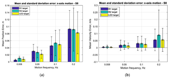 The results for the performance of SVGS deployed on a Samsung S8 smartphone for three different targets (R1, R2 and LED) at different target velocities (0.2, 0.1, 0.05 and 0.008 Hz at 1 m amplitude) for linear and angular motion tests are shown in Figure 17, Figure 18 and Figure 19. Performance is shown as the mean positioning and velocity error, and the thin bars show the corresponding error distribution (spread) over ±1 standard deviation around the mean error. Figure 20 shows the mean SVGS sampling rate for various SVGS targets and target speeds.