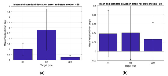 Figure 17 and Figure 18 show that the mean positioning error for all types of SVGS targets increases with target velocity, as expected. LED targets consistently show smaller positioning errors compared to retro-reflective targets. The same can be said from the corresponding errors in linear velocity estimates, as expected. Figure 19 shows the mean errors and standard deviations of the angular position measurements and angular velocity estimates. Angular motion tests also show substantially better performance when using LED targets (a mean error of less than 0.25°) compared to retroreflective targets (a mean error of 1° for the R1 target).