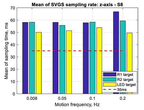 Figure 20 shows the mean SVGS sampling time for different motion velocities and SVGS targets. The test was conducted at 35 msec update rate in the SVGS software: the intention was to identify whether a relationship existed between the target velocity and target type, and the convergence and average sampling rate of SVGS. No significant dependency is found between the sampling time and different motion profiles or types of targets; however, LED targets consistently converge faster and therefore provide a faster sampling rate compared to retro-reflective targets (R1 and R2).