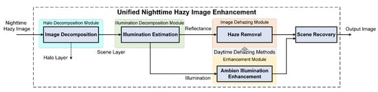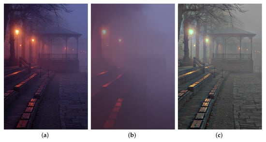 Based on single scattering haze model in (1), various approaches have been proposed to address the single image dehazing problem [,,,,,,,]. In recent years, encouraged by the milestone progress in single image dehazing—known as the Dark Channel Prior []—the performance of single image dehazing has been improved continuously [,,,,,,,]. With the development of machine learning technique, learning-based methods, especially the convolutional neural network (CNN) based methods, have also been introduced to single image dehazing [,,,,,,,,]. Cai et al. proposed an end-to-end DehazeNet to estimate transmission map []. The scene radiance was then recovered according to the single scattering model. Ren et al. further improved the accuracy of transmission estimation by introducing a multi-scale deep neural network []. Li et al. introduced a lightweight end-to-end CNN based AOD-Net for image dehazing by generating the haze-free images directly []. Zhang et al. also addressed the end-to-end dehazing problem under a deep learning based densely connected pyramid dehazing network []. Approaches using generative adversarial networks have also been studied in recent years [,,,] Although these methods are capable of recovering satisfying results in daytime, their performances on nighttime dehazing are quite limited. In addition, learning based methods, especially the data-driven deep learning based approaches rely on the sufficient training data. However, datasets containing a large number of paired earl nighttime hazy images and corresponding clear scene images are practically unable to obtain due to the complex environmental illumination.