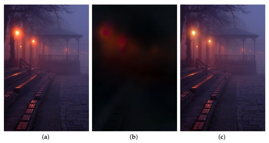 The non-convex problem in (6) can be optimized via the alternating direction method of multipliers (ADMM) as in References [,]. Figure 2 shows a result of halo layer separation. It is observed in the scene layer that halo effect around light sources is mitigated, compared with the observed nighttime hazy image.