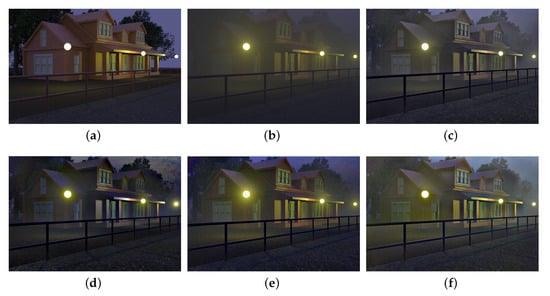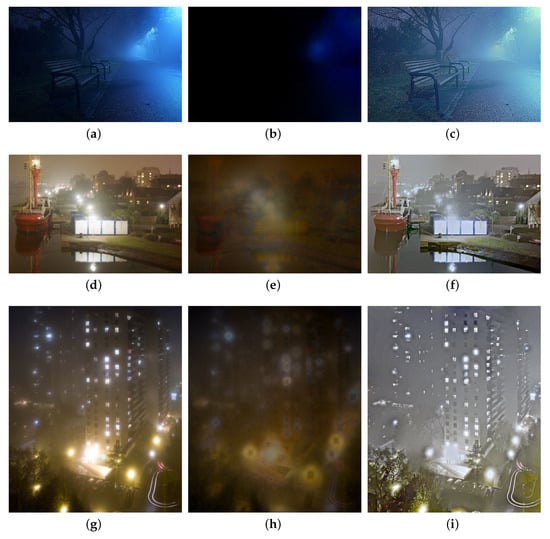As discussed above, one major problem of nighttime hazy images is detail and visibility degradation of objects around light sources caused by the multiple scattering of nearby illuminants. Inspired by Li’s work [], an observed hazy image can be modeled as a linear superimposition of a scene layer which contains haze and scene information, and a halo layer which indicates halos and glows around illuminants. Consequentially, Equation (3) can thus be written as: