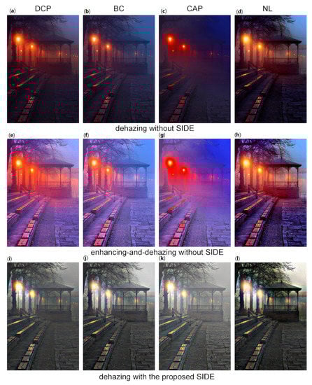 Illustration of the proposed SIDE. (a–d): results of conventional daytime dehazing methods without SIDE; (e–h): results with the enhancing-and-dehazing flow (enhanced by LIME []); (i–l): results of corresponding methods with the proposed SIDE. From left to right: dark channel prior (DCP) [], boundary constraint method (BC) [], Color Attenuation Prior (CAP) [] and Berman’s non-local method (NL) [].