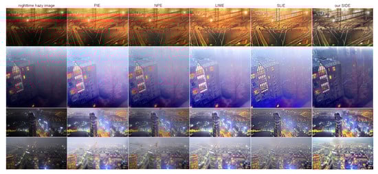 We also compare our SIDE with different low-light enhancement methods in Figure 6. Specifically, the probabilistic image enhancement method (PIE) [], the naturalness preserved enhancement method (NPE) [], the low-light image enhancement via illumination map estimation (LIME) [] and the structure-revealing low-light image enhancement method (SLIE) [] are employed for comparisons. It is easily observed that although existing low-light enhancement methods can significantly increase the contrast of the nighttime hazy images, haze remains in the enhanced results.