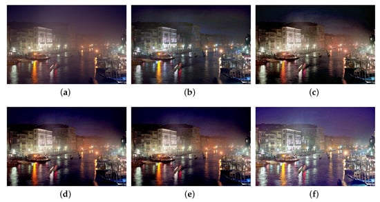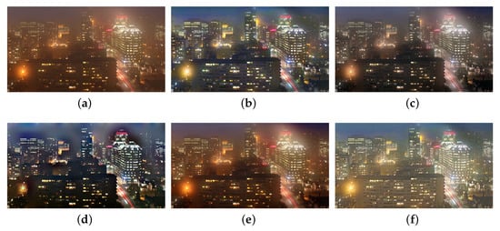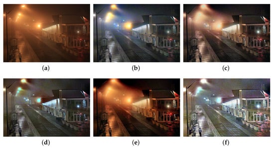 Unlike uniformly distributed sunlight as the dominate light source in daytime, illumination varies spatially during the night. In addition, the overall brightness of the scene could be extremely weak, resulting failures of currently used priors and assumptions, such as the dark channel prior [] and the color attenuation prior []. Moreover, significant halo effect caused by multiple scattering can be observed around light sources in hazy night, which is not considered in the commonly used daytime dehazing model. In order to overcome these problems, several techniques have been introduced with novel assumptions recent years, such as bright alpha blending [], color transfer [], maximum reflection prior [] illumination correction [], glow removal [] and image fusion [,]. However, although the nighttime haze can be removed from the observed images, color distortion still exist in the dehazed results. In addition, visibility and scene details are reduced and hidden due to the low ambient illumination. While various methods have been proposed for low-light image enhancement and have achieved satisfying results [,,,], practically, dehazing and brightening are regarded as two independent problems in nighttime image processing. As the result, ambient illumination remains dim in dehazed nighttime images, while haze remains in the low-light enhancement results. Although the result can be obtained by a dehazing-and-enhancing flow, severe color distortion could appear. Therefore, it is argued that both brightness enhancement and dehazing are crucial for visibility improvement of nighttime hazy images.