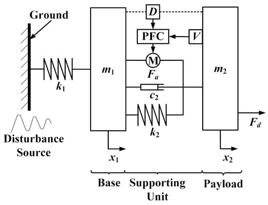 As shown in Figure 2, the VIP system is composed of a passive supporting unit and an active control system. The payload and the base are modeled as two rigid bodies, i.e., the masses m2 and m1, respectively. They are interconnected by the passive supporting unit consisting of the stiffness k2 and the damping c2. The disturbance is transmitted from the ground to the mass m1 through the stiffness k1 to produce the external disturbance x1. The payload position x2 is disturbed by an external disturbance x1 and a direct disturbance Fd. The passive supporting unit can sufficiently attenuate high-frequency external disturbances x1, but this amplifies the vibrations around its inherent frequency and limits its ability to suppress the direct disturbance Fd. In the active control system, a velocity sensor located on the payload is used to measure the absolute velocity of the payload, and an eddy-current sensor positioned in parallel with the supporting unit is used to obtain the relative position δD between the payload and the base. The actuator M is a voice coil motor (VCM) that is used to produce a force Fa according to the AVI and positioning control. As shown in Figure 3, to attenuate the absolute velocity x2 and maintain the relative motion δD, the PFC is composed of the AVI controller Hv(s), the positioning controller Hd(s), and the filters ωv(s) and ωd(s).