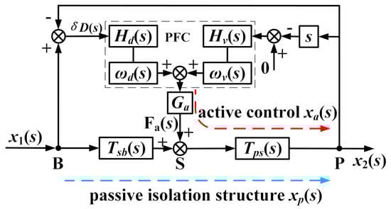 Block diagram of the PFC strategy for VIP. The PFC is shown in the dotted box. The external disturbance x1 is transmitted to point P by the active control loop, shown as the red dotted line, for which the response motion is xa; by the passive isolation structure, shown as the blue dotted line, for which the response motion is xp.