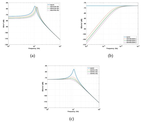 The influence of RPF on the deformation transmissibility is shown in Figure 5. The effect of kdp is equivalent to the mechanical stiffness parallel to k2, which can be used to increase the supporting stiffness. The addition of kdp increases the natural frequency and decreases the amplitude at low frequencies and the peak. The effect of kdi is equivalent to eliminating the steady-state error of the position and solving the leveling problem for the supporting system [26]. The amplitude is decreased at ultra-low frequencies with the addition of kdi. The effect of kdd is equivalent to adding relative damping between the base and the payload. With the addition of kdd, the amplitude around the inherent frequency is decreased gradually.