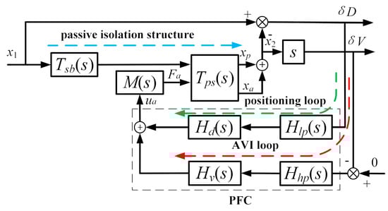 Block diagram of the PFC with the filter pair. The blue dotted line is the transfer path of the passive isolation structure, the green dotted line is the positioning loop, and the red dotted line is the AVI loop.