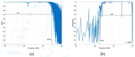 Coherence values between the signals of the actuator and the sensors: (a) XS4P18AB120 eddy-current sensor and (b) GS-11D-H velocity sensor.
