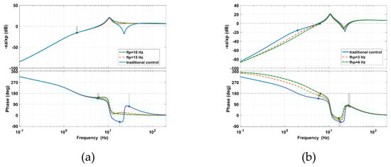 The gains of Hv(s) and Hd(s) are taken with moderate values as kvd = 2 m2/Ga, kvp = 8 c2/Ga, kdp = 0.5 k2/Ga, kdi = 3 Dc/(Gek2), kdd = 8 c2/Ga. As shown in Figure 9, it can be seen that the adjustment of the cut-off frequencies will impact the gain margin and phase margin, meaning the gains of Hv(s) and Hd(s) should be reduced to ensure the system stability. The gain margins and phase margins according to different cut-off frequencies are listed in Table 2.
