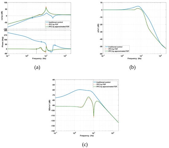 In Figure 12, it can be seen that the approximations of the fractional-order derivatives s0.5 and s0.8 are suitable through comparing the theoretical and approximated bode diagrams. Moreover, as shown in Figure 12a, the PFC based on FOFs results in a phase margin of 179° at 3.21 Hz and provides more stability than the traditional control. As shown in Figure 12b,c, the PFC based on FOFs can simultaneously decrease the amplitude of the vibration transmissibility at high frequencies and the deformation transmissibility at low frequencies. This shows that the amplitudes of the vibration and deformation at the peak are restrained because the FOFs provide a larger gain range for Hv(s) and Hd(s) to coordinate the AVI and positioning.