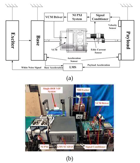 As shown in Figure 13, the experimental system was established to verify the PFC. It can be seen that the single-DOF VIP system and the exciter are hung on the frame to avoid additional stiffness and damping along the motion direction. The two mass blocks corresponding to the payload and the base are connected by the supporting unit through two flexure hinges. This ensures that the experimental system is only affected by the axial force. The NI (National Instruments) PXI (Peripheral Component Interconnection extensions for Instrumentation) real-time system collects the feedback signals from the velocity sensor and eddy-current sensor through the PXI-6123 acquisition card and controls the VCM to actuate the VIP system. The LMS (Leuven Measurement & System) SCADAS (Supervisory Control And Data Acquisition) system controls the MB Dynamic MODAL110 instrument to simulate the base excitation and analyzes the control performance according to the vibration signals of the base and the payload, which are collected by the PCB356A17 acceleration sensor.