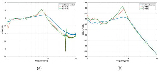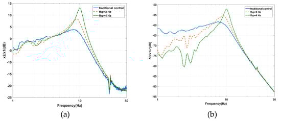 As shown in Figure 16a, the PFC based on FOFs moves the cross-frequency to 8.6 Hz and diminishes the maximum value to 3.3 dB at 6.93 Hz for the vibration transmissibility. Compared with the traditional control and the PFC based on IOFs with a fhp value equal to 4 Hz, the PFC based on FOFs improves the AVI performance from 6.54 Hz to the end of the frequency range. It seems that the vibration transmissibility at high frequencies is moved forward. The PFC based on IOFs with an flp value equal to 10 Hz can also achieve this effect at the cost of amplifying the amplitude around the inherent frequency. The AVI performance is improved by the limited control bandwidth of the positioning and the increased gains of kvp and kvd. These targets can be realized by the PFC based on FOFs simultaneously, which is not possible with the PFC based on IOFs.
