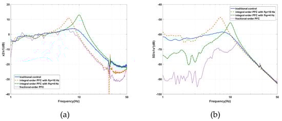 As shown in Figure 16b, the PFC based on FOFs restrains the maximum value to –64.96 dB at 12.79 Hz for the deformation transmissibility. Compared with the traditional control and the PFC based on IOFs with an flp value equal to 10 Hz, the deformation performance is significantly improved when the frequency is less than 12.7 Hz. The PFC based on IOFs with an fhp value equal to 4 Hz can also enhance the positional stability at low frequencies; however, not to the same degree as with the PFC based on FOFs. The amplitude around the inherent frequency is also amplified. The PFC based on FOFs improves the positioning performance by limiting the control bandwidth of the AVI and increasing the gains of kdp and kdd. The deformation transmissibility starts to increase from about 10 Hz due to the control bandwidth of positioning being limited by the filter.