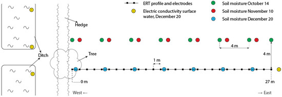 Plan view of the electric resistivity tomography (ERT) sensor 2016 set-up, including ERT electrodes, soil moisture measurement points, and surrounding features. The ERT transect of 27 m length is indicated by a black line and the small black squares indicate the positions of the electrodes with 1 m spacing. The colored circles illustrate the locations of the gravimetric sampling. October (green) and November (red) measurements were taken parallel to the ERT transect at a distance of 4 m away from the ERT transect to avoid disturbance to the ERT experiment. The December (blue) measurements were taken along the ERT transect in between the electrodes at the end of the experiment. Yellow circles represent the locations of Electric Conductivity (EC) measurements in surface or groundwater to determine possible effects on the ERT measurements.