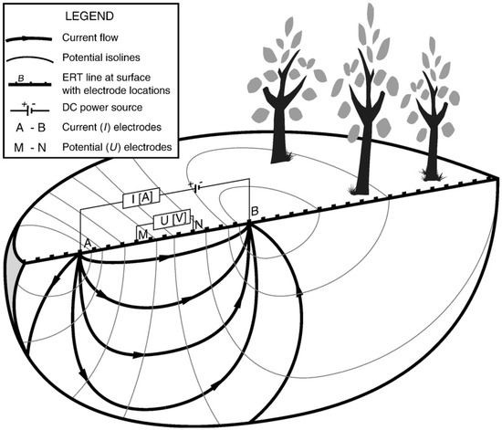 - Brunet, P.; Clément, R.; Bouvier, C. Monitoring soil water content and deficit using Electric Resistivity Tomography (ERT), a case study in the Cevennes area, France. J. Hydrol. 2010, 380, 146–153. [Google Scholar] [CrossRef]