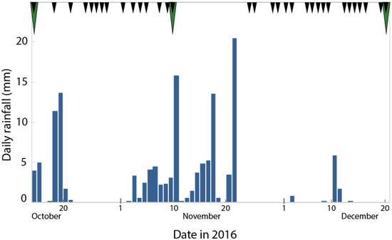 Daily rainfall measured at the experiment site and resistivity ERT measurement taken, the black triangles at the top of the image represent acquisition of ERT profiles. Gravimetric soil moisture was determined three times on 14 October, 10 November, and 20 December as indicated by the green triangles.