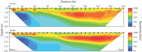 ERT data were collected using the Sting R1/IP advanced resistivity meter with a one-channel receiver with an array of 28 electrodes (www.agiusa.com). We used a Schlumberger configuration with 1 m spacing over a transect length of 27 m, which provides reliable resistivity information to a depth of approximately 5.5 m for the largest electrode spacings within the total line and provides the best trade-off between horizontal and vertical resolution [30,31,32,33]. We used a maximum “a” (distance between M and N, see Figure 3) of 3 electrode distances, and “na” (distance between A and M or B and N, see Figure 3) with ‘n’ between 1 and a maximum of 9. Data points with an elevated reciprocal and/or repeat error of 2% were removed in the acquisition process. Inversion of the data was done with EarthImager2D [30]. The inversion is based on a two-loop iterative nonlinear inversion. We solved the nonlinear inverse problem using the Gauss–Newton method with a calculated sensitivity matrix. The forward modeler that we used is based on a finite element method which produces more accurate forward modelling solutions than a finite difference approach, considering the same mesh discretization. We used a Cholesky decomposition forward solver which is numerically very robust and stable. Misfits are based on a standard misfit function and expressed in root mean square (RMS) or L2-norm. Inversions were stopped after four iterations or by a RMS error reduction of less than or equal to 1.5%. Our initial model is a homogenous half-space with the average apparent resistivity value as starting value. We use the same strategy for the absolute and time-lapse inversions with the difference that for follow-on steps in the time-lapse we use the reference measurement (first data take at 14 October) as starting point for the difference inversion (note that we do not subtract absolute value images but run an inversion on the differences, see for details [30,31,32,33,34]. The set-up was maintained on the site for 67 days and in total 33 ERT measurements were carried out (Figure 4). Gravimetric soil moisture was determined three times (Table 1).
