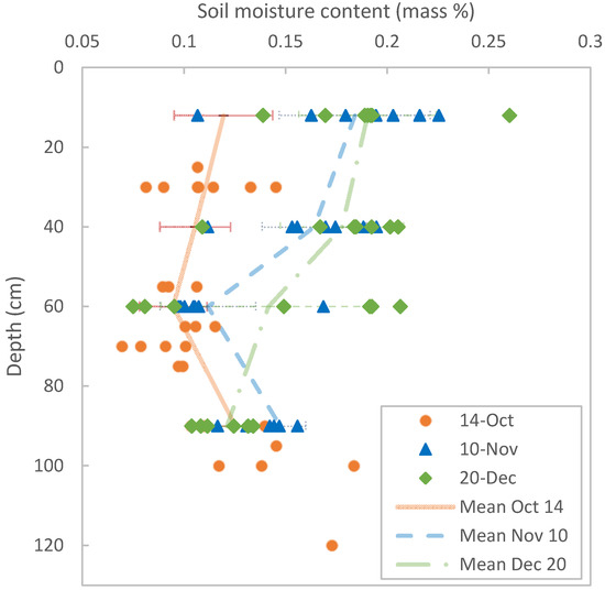 Soil-moisture measurements at the three dates, represented by circles, triangles, and diamonds. The lines represent the average soil moisture of the whole transect at that date. Average values for 14 October have been inter- and extrapolated for the sake of comparison with the other average values. The error bars represent the standard deviation of all measurements.