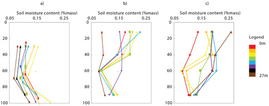 Individual soil moisture profiles taken on the ERT transect at different distances and at three dates: (a) at 14 October, (b) at 10 November, and (c) at 20 December.