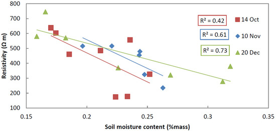 Figure 8 illustrates the correlation between measured gravimetric soil moisture and ERT measured resistivity, i.e., the closest pixel value, for a depth of 90 cm, as indicated by the dashed line in Figure 5, for the three dates and for all auger locations. To calculate the regression line and coefficient, we assumed a relationship based on Archie’s Law [33,34]. Archie’s law relates the (in situ) electrical conductivity of a material to its porosity and saturation. The resistivity of a rock is proportional to the resistivity of the dry material and the resistivity of the pore space. Archie’s law is valid in clean porous media with a non-conductive rock matrix, like pure sands, so without considerable amounts of clay [9]. Soil moisture values have been interpolated for non-sampled locations. Correlation for the three dates range from 0.43 to 0.73. The correlation between these two variables was best for a depth of 90 cm, where the soil consists of pure aeolian sand and where the variation of water content is large. Correlation at a depth of 60 cm are a bit lower and range between 0.43 and 0.61. Correlation at 90 cm depth is best for the samples collected on 20 December with an R2 of 0.73 (p-value of 0.014), followed by the samples collected on November 10th with a R2 of 0.65 (p-value of 0.053) and followed by the samples of 14 October having a R2 of 0.43 (p-value of 0.079). Correlations are reasonable, but ideally (n of samples) populations should be larger to increase significance.
