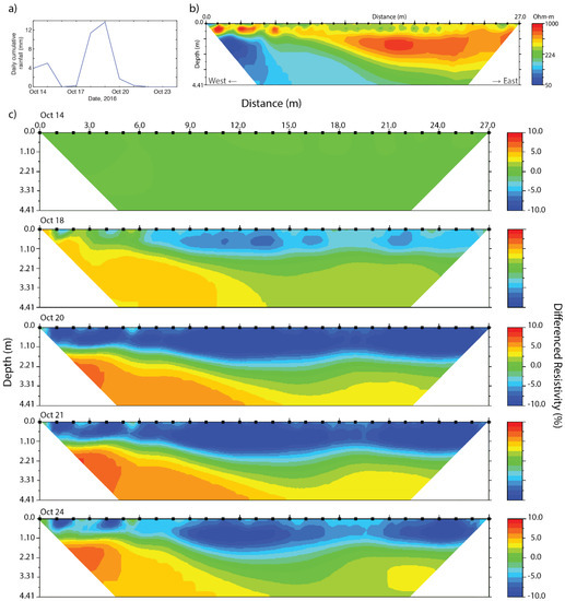 Time-lapse resistivity profiles, indicating soil moisture dynamics, with (a) rainfall from 14 October to 24 October, (b) the base profile of 14 October, and (c) the differenced profiles from 14 October to 24 October. Note the anomaly at the far left side of the profile (further discussed in the text).