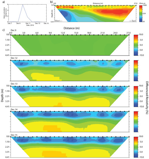 Time-lapse ERT resistivity profiles, illustrating moisture dynamics, with: (a) rainfall from 7 to 15 December, (b) the base profile of 9 December, and (c) the differenced profiles from 9 December to 15 December.