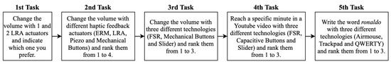 In the 1st task, the goal was to gather the UX regarding the use of one versus two LRA actuators. The user was asked to increase and decrease the sound volume using the capacitive buttons, with the top button associated with one LRA-based haptic feedback, and the bottom button associated with the two LRA-based haptic feedback. In both cases, the haptic feedback effect associated with the LRA was the one preferred in previous studies, as detailed in [20]. Without knowing the difference between the two feedbacks, the user was asked to identify which effect she/he preferred.