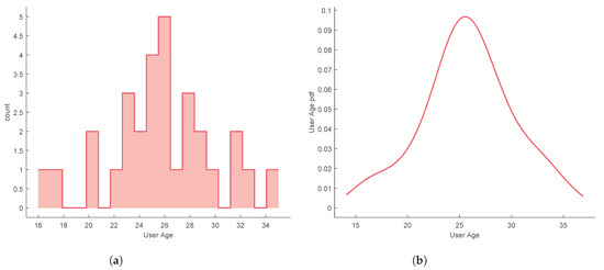 Users’ age characterization; (a) Age histogram; (b) Probability density function of users’ age.