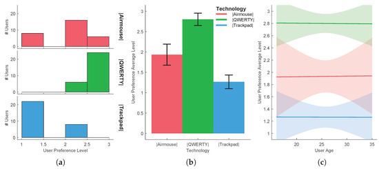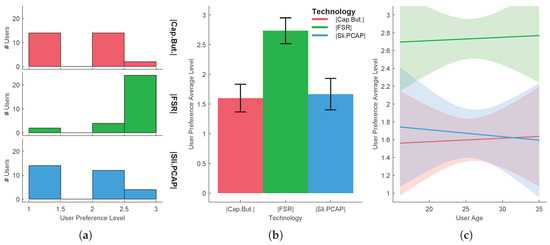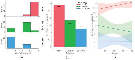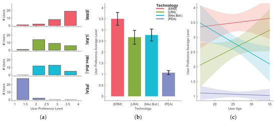 Task 2-user preference level in single-click actions using four different haptic technologies: (a) distribution per treatment, (b) mean and standard deviation, (c) evaluation function of users’ age.