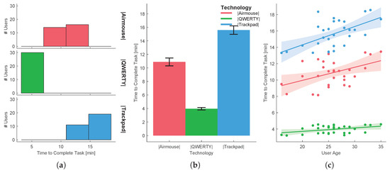 Task 5-text input using three different haptic technologies: (a) distribution per treatment, (b) mean and standard deviation, (c) evaluation function of users’ age.