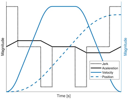 This section presents the background of the S-curve velocity profile. In Figure 2, the position, S-curve velocity profile, trapezoidal acceleration, and square jerk are displayed. As is well known, the S-curve is a seven-segment profile, where the total time displacement can be symmetric or asymmetric distributed. The acceleration and deceleration phases have the same length of time,  and they are represented by three stages. The design of a trajectory is based on the desired position  and the time displacement T. The maximum velocity reached by the profile is computed in Equation (11).